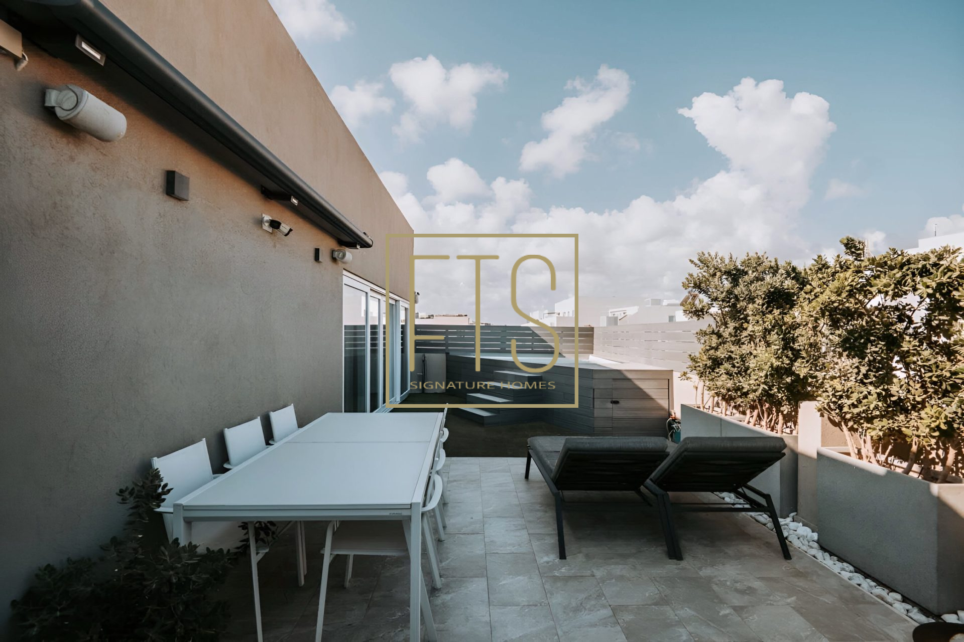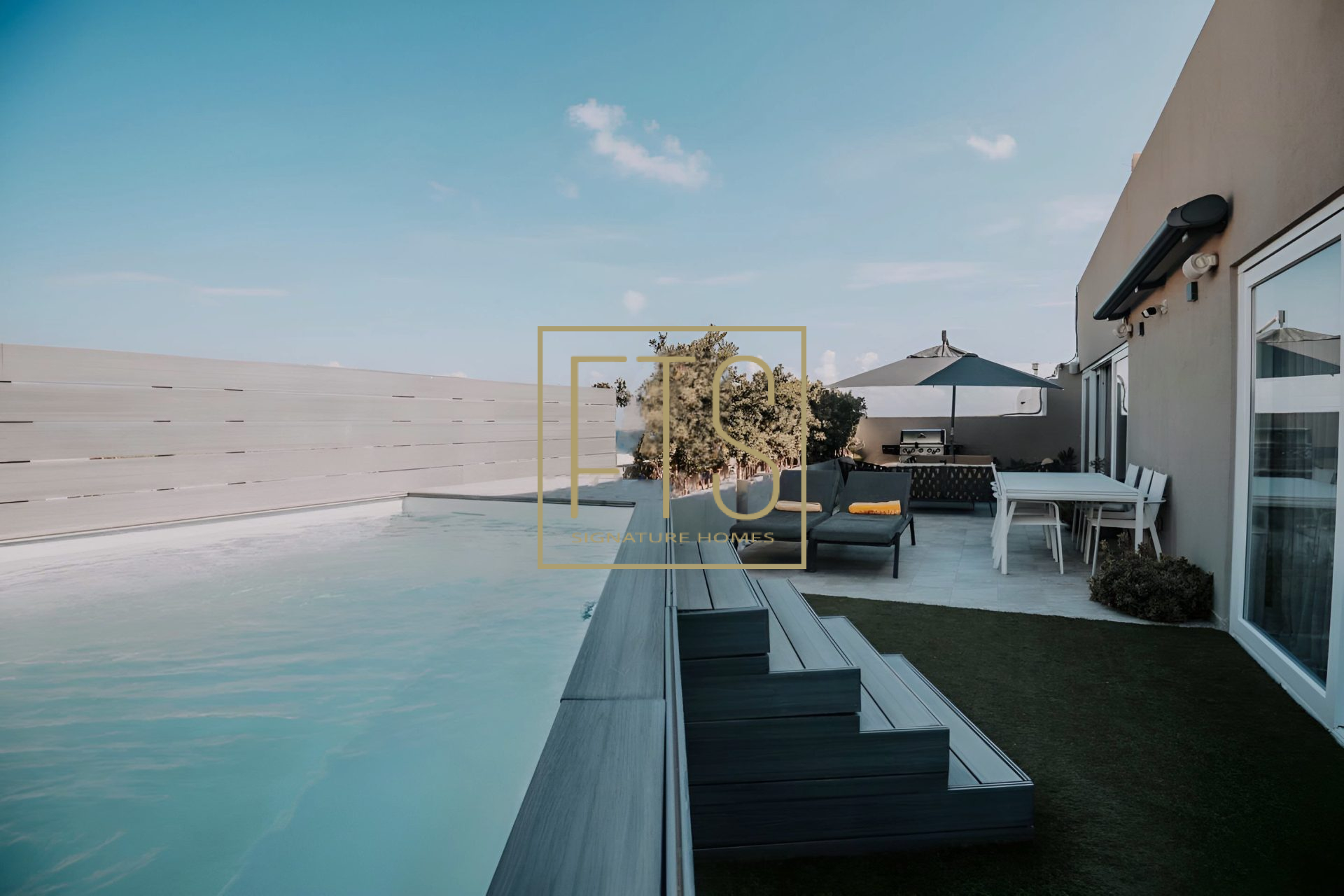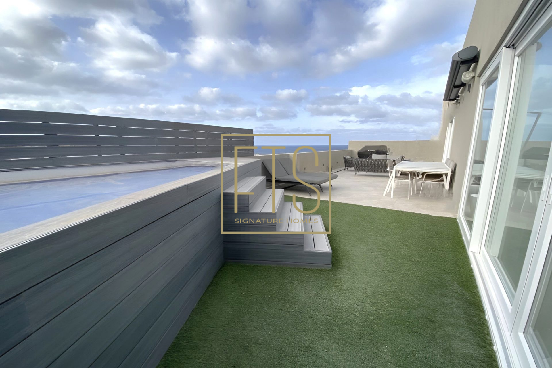 A truly one of a kind luxurious Penthouse, finished to very high specifications, enjoying side sea–views from its spacious front terrace. Layout comprises a living room having a wood burning fireplace leading to a 70sqm front terrace with a small swimming pool ideal for entertaining, a fully fitted kitchen, 2 double bedrooms both of them with en-suite facilities and the main with a walk-in wardrobe, guest bathroom, laundry room, fully equipped cinema room and a back terrace. A one car lock–up garage and full airspace compliment this property.