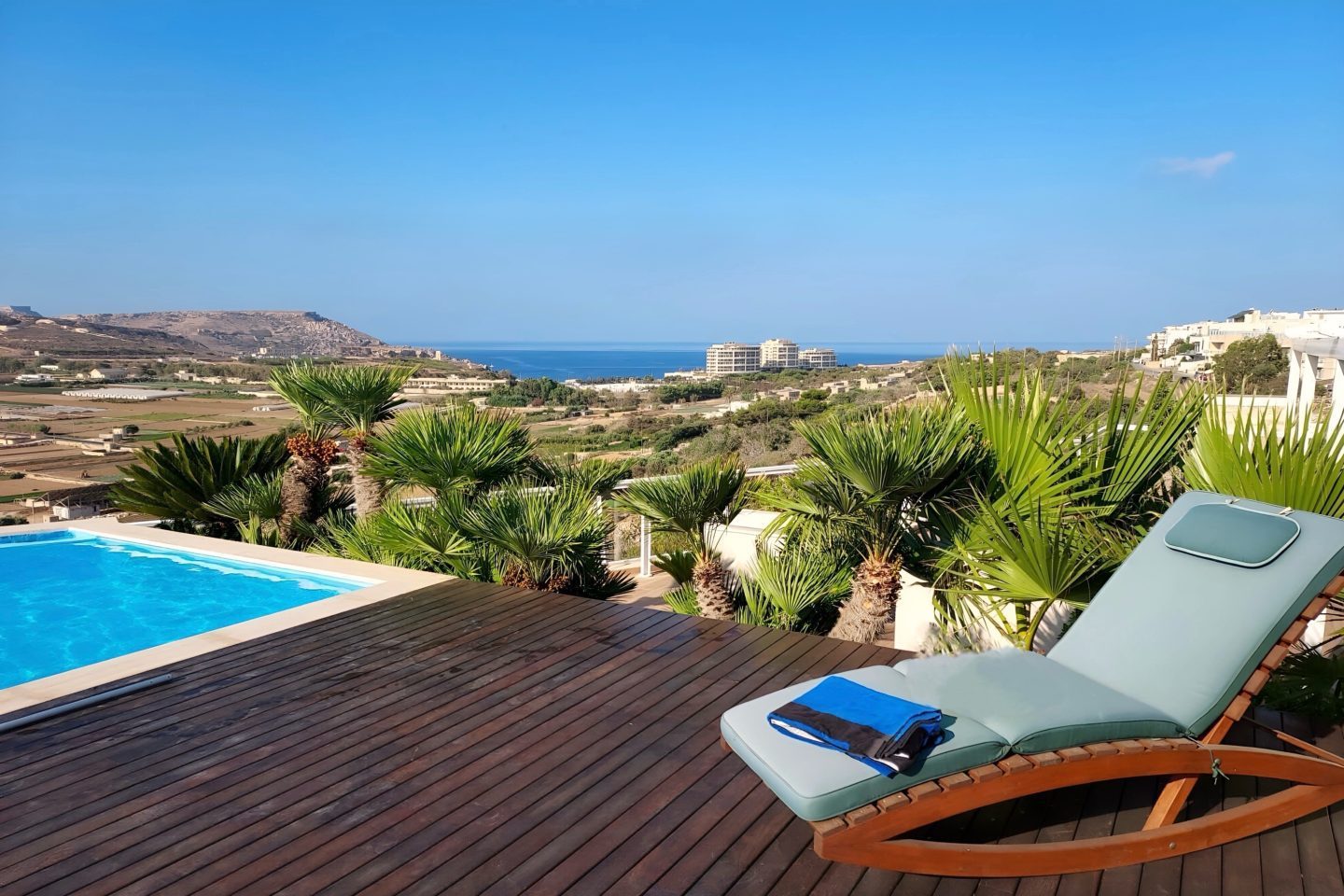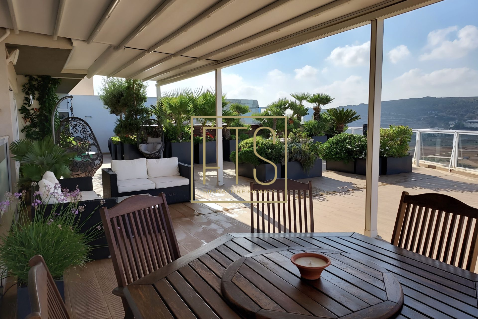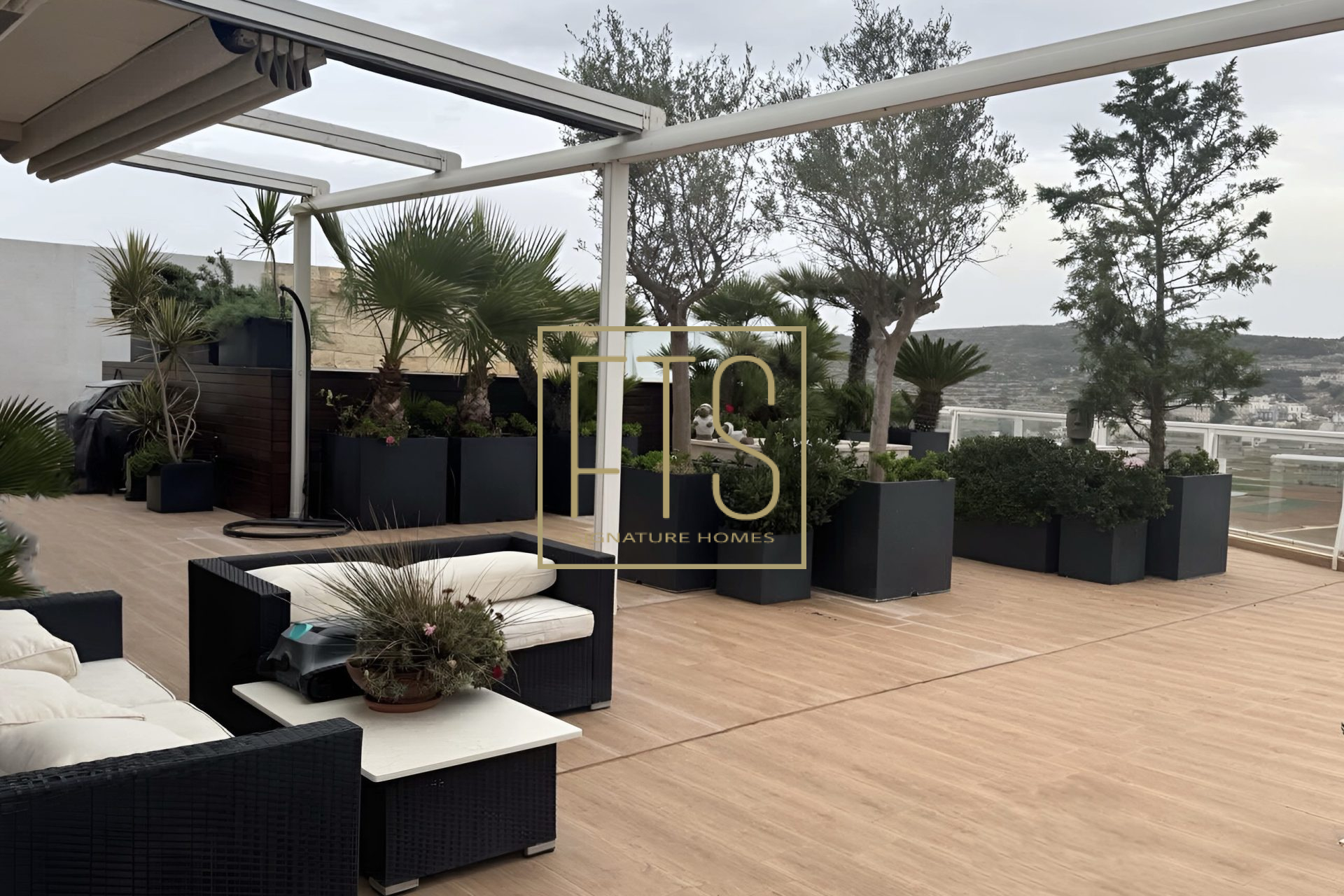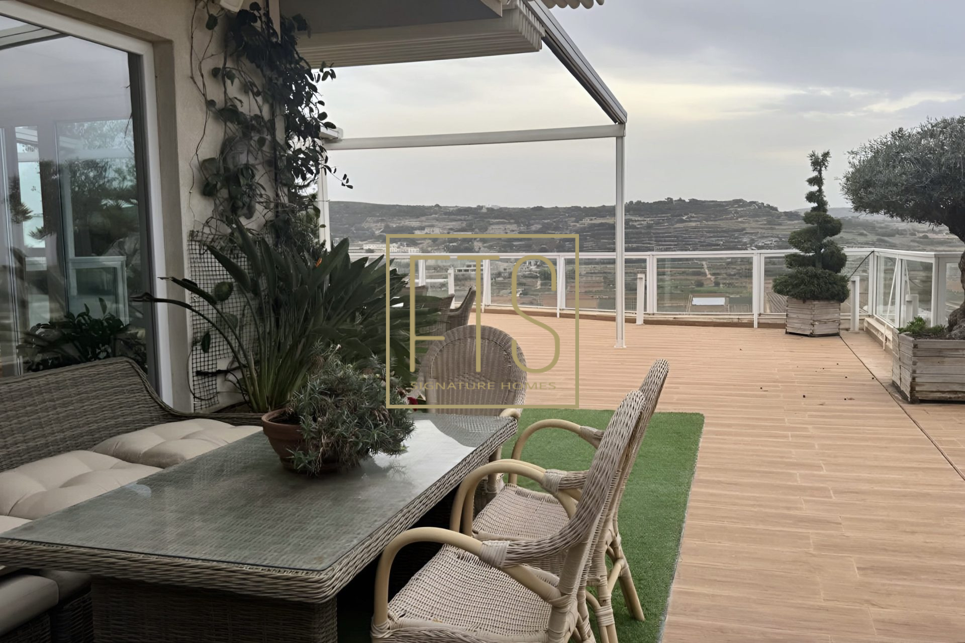 Step into this expansive, light-filled property where generous open spaces meet breath-taking views in every direction. Floor-to-ceiling windows frame sweeping panoramic views of the surrounding landscape, bringing warmth and natural light into every room. The layout is thoughtfully designed, featuring a spacious living area that is perfect for entertaining, a modern kitchen with high-end finishes and appliances, and serene bedrooms that offer both comfort and privacy. Elegant details are present throughout the home, along with multiple vantage points for enjoying stunning sunsets from the massive terrace, which also features a pool and decking area. This property seamlessly blends luxury, tranquility, and sophistication into one exceptional living experience. The layout comprises an entrance hall, a fitted kitchen/living/dining area, a bathroom, 3 double bedrooms (main with en-suite) and a laundry room. Further complementing this property is an underlying garage that accommodates 4 cars and provides ample storage.